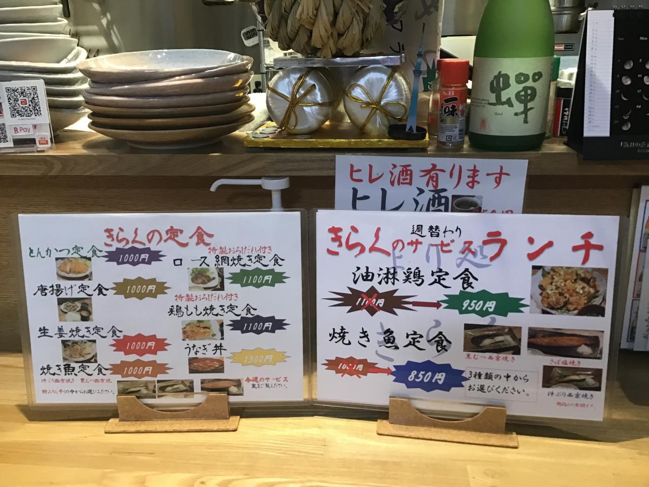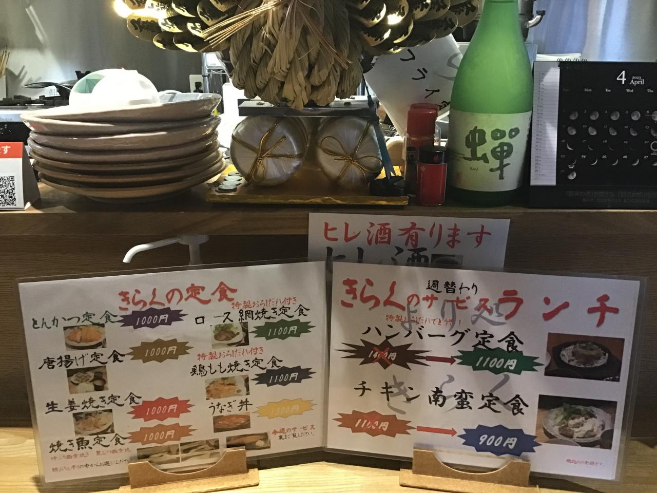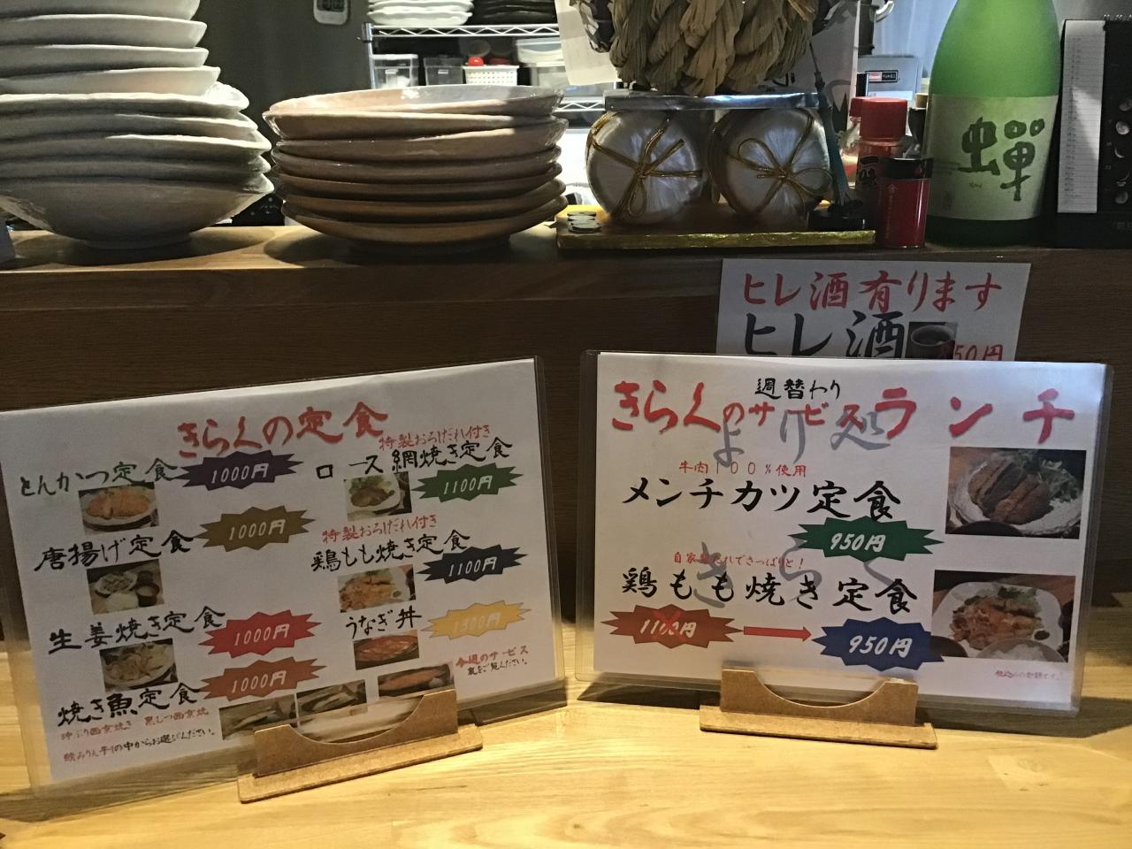 今週のサービスランチは牛肉100%使用したメンチカツ定食と鶏もも焼定食をご用意しましたので是非きらくにどうぞ食べに来てください。
